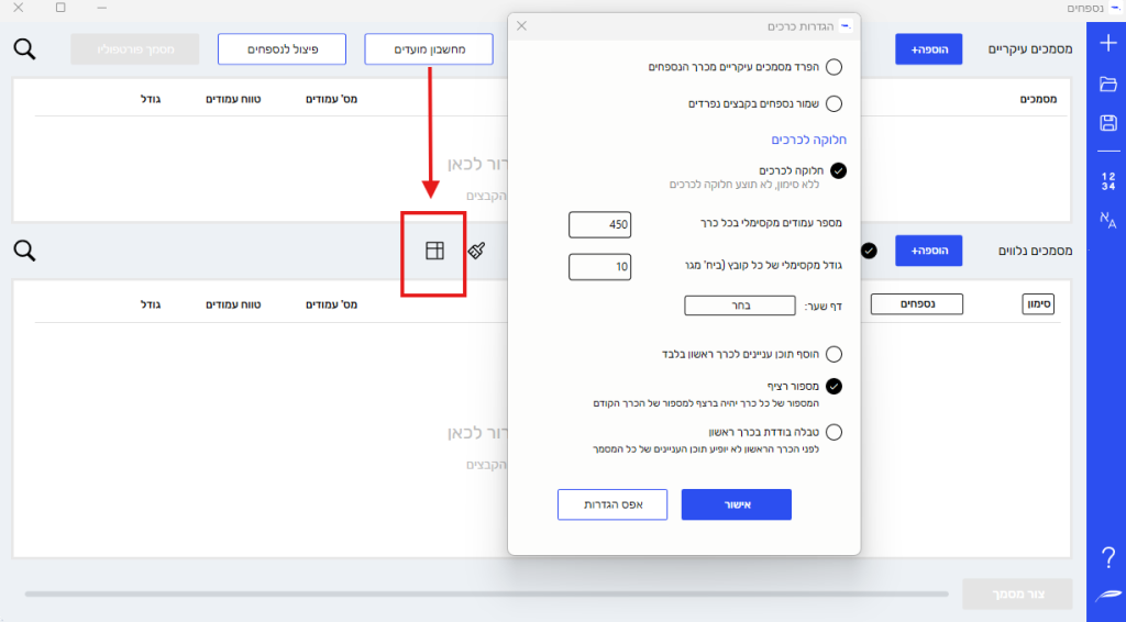 - חשוב לציין – התוכנה לא תפצל נספח בין כרכים שונים, כל נספח ישובץ בשלמותו בתוך כרך אחד.