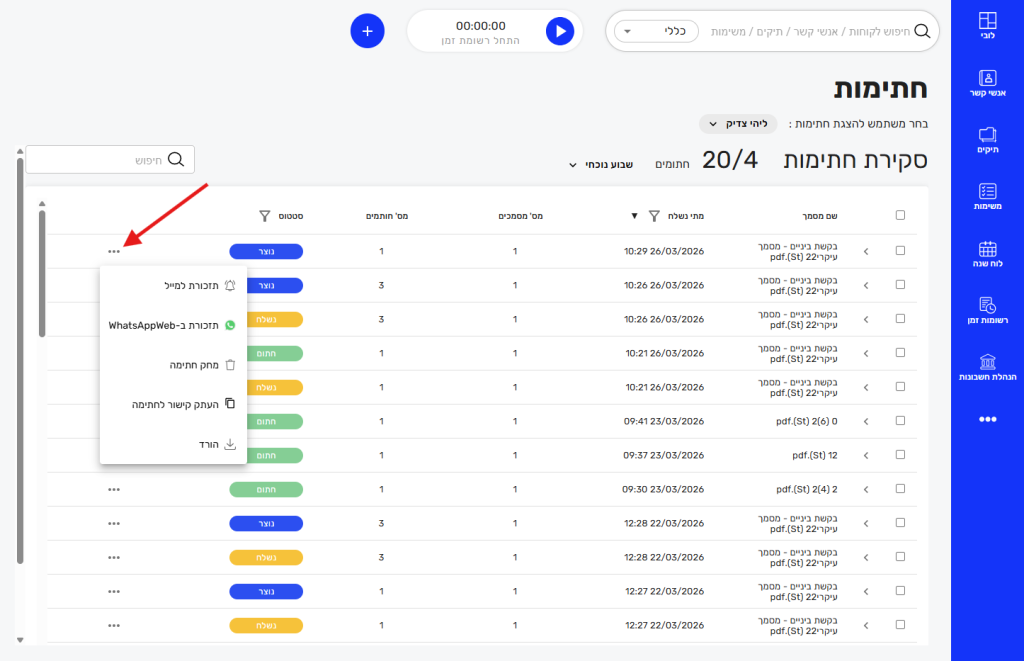 - בצד שמאל יש כפתור אפשרויות לביצוע פעולות שונות כמו הורדת המסמך, העתקת הקישור ושליחת תזכורות דרך מייל/ווצאפ ווב ללקוח.