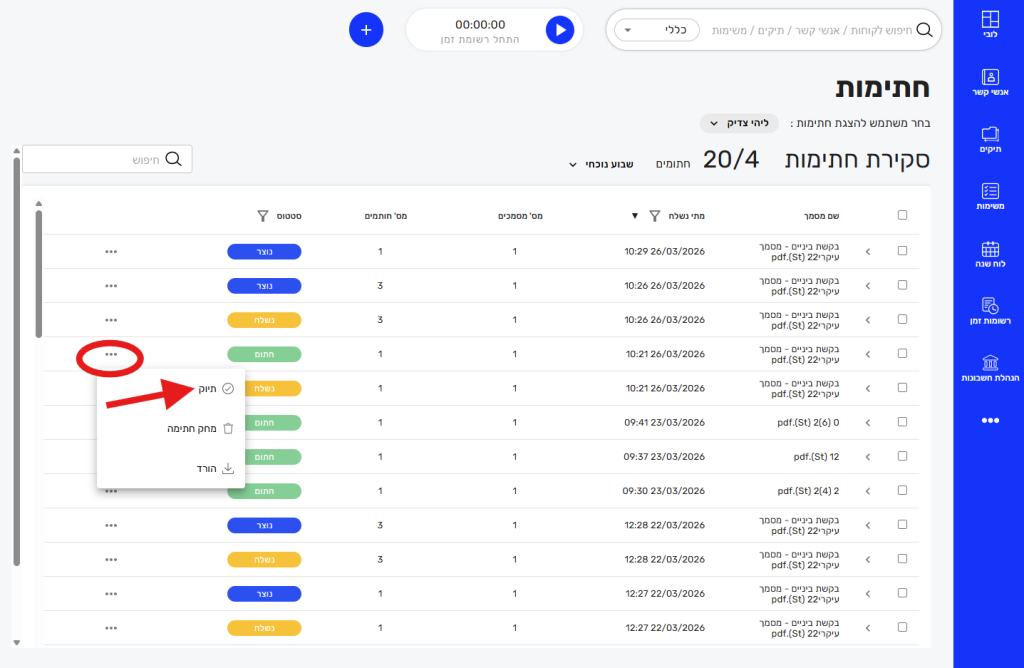 - תוכלו גם לתייק מסמך שבסטטוס "חתום" בכרונולוגיית החתימות של התיק ובתיקיית המסמכים של התיק.