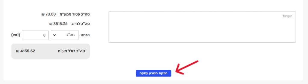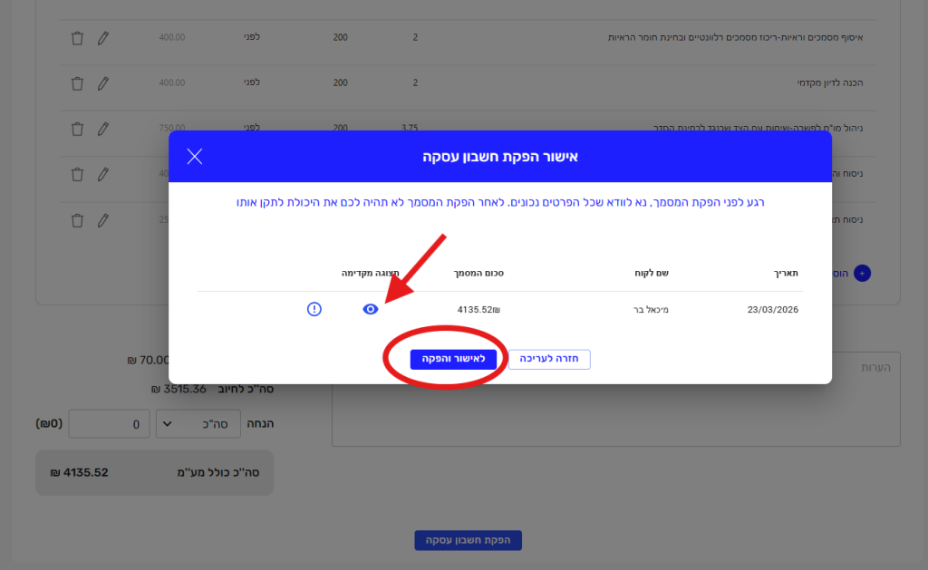 - נלחץ על כפתור "הפקת חשבון עסקה" ונצפה בתצוגה המקדימה לאימות הפרטים.