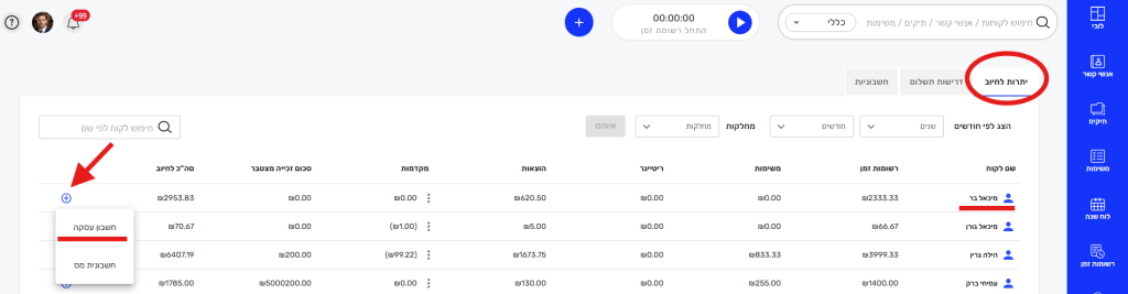 - בטבלת "יתרות לחיוב" נאתר את הלקוח שנרצה להפיק לו דרישת תשלום ונלחץ על כפתור הפלוס ליצירת מסמך חשבון עסקה.