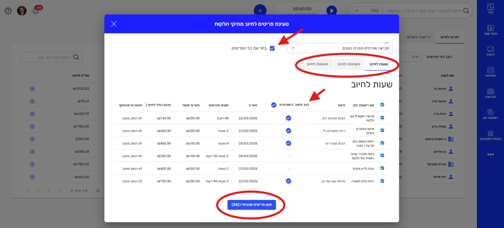 - נטען פריטים לחיוב שהזנו בתיק (משימות/ הוצאות/ שעות לחיוב/ אחוזי זכייה/ ריטיינר).