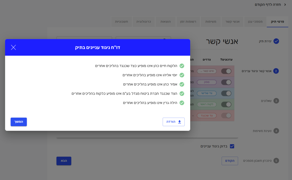 2. אנשי קשר וניגוד עניינים: ניתן לצרף אנשי קשר, להגדיר צד (לקוח/צד שכנגד/ספק/צד שלישי/עורך דין של צד כשנגד) ולבצע בדיקת ניגוד עניינים.