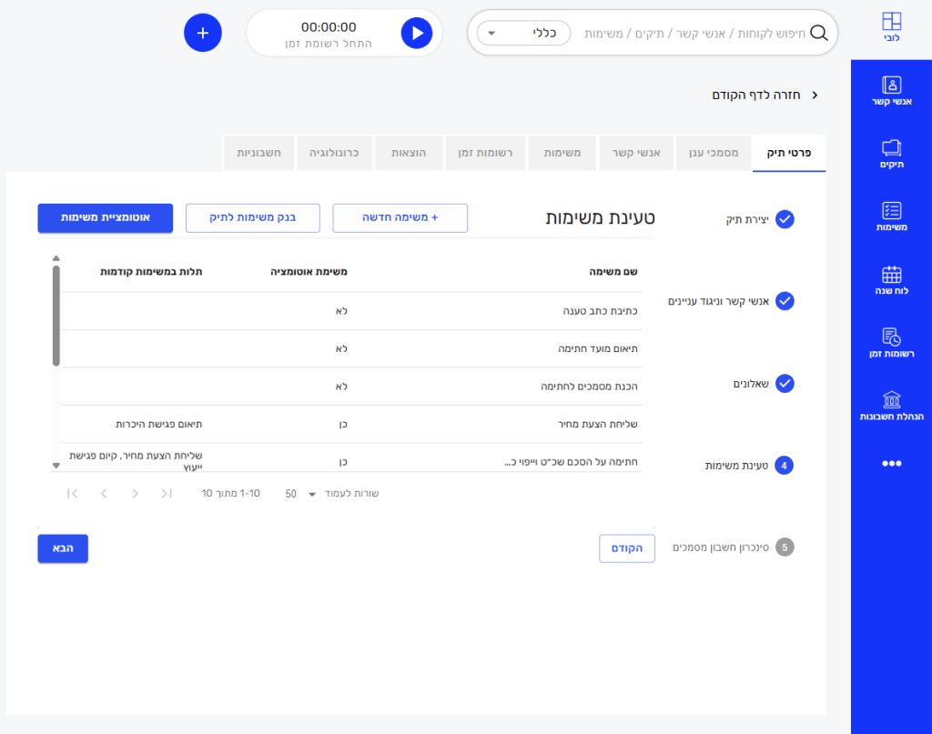 מסמכים, משימות, חיובים, הוצאות, הערות וכל מידע אחר שנרצה לאחסן עבור התיק.