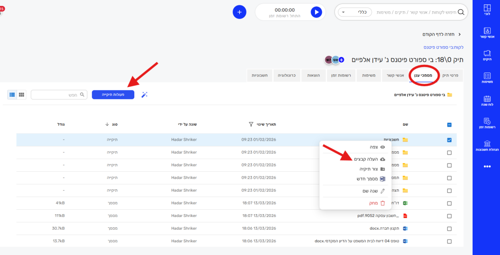ניתן לשייך לכל תיק תיקיית מסמכים מחשבון הענן, ולהעלות אליה מסמכים ישירות מהמערכת.