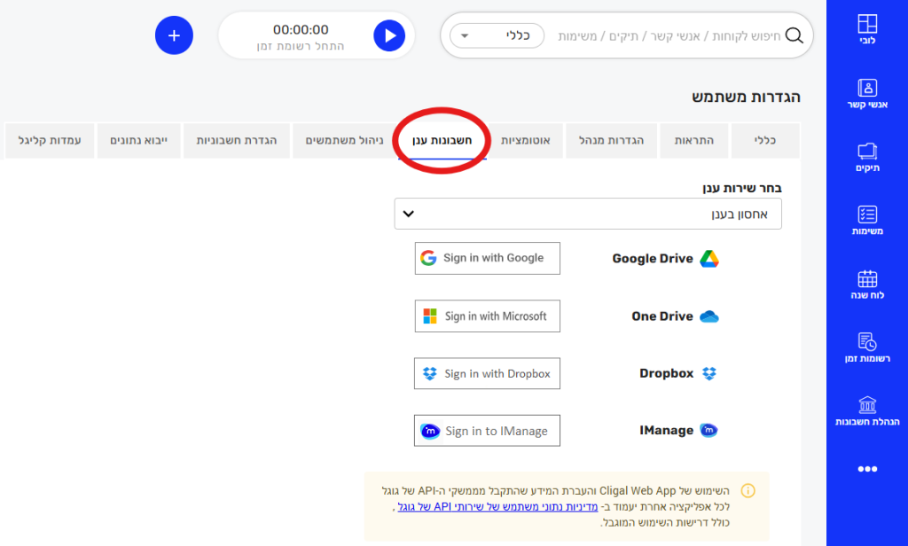 - יש ללחוץ על "חשבונות ענן", לבחור ב"אחסון ענן" ולשייך את חשבון הענן של אחד מהשירותים הבאים: Google Drive, OneDrive, Dropbox.