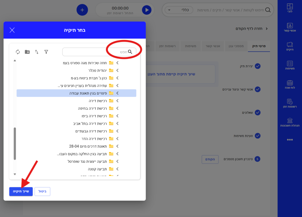 2. שיוך תיקייה קיימת מהענן: תחילה יתבצע חיפוש אוטומטי של התיקיה בענן לפי שם התיק שהגדרתם ותוכלו לבחור את התיקיה המתאימה. במידה ולא נמצאה תיקיה מתאימה ניתן לשייך ידנית.