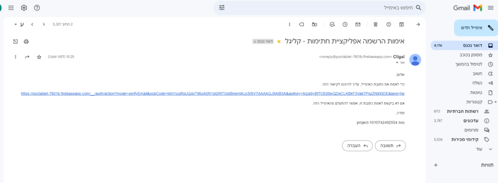 לאחר שביצענו הרשמה למערכת, יש לאמת את המייל שלכם דרך "דואר נכנס".